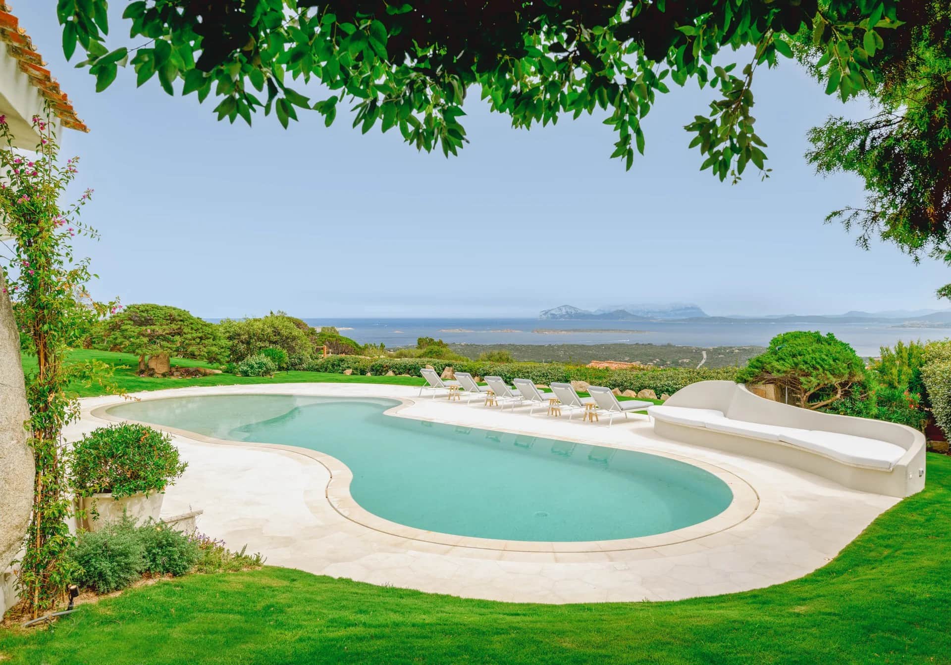 The exteriors feature lush Mediterranean gardens, meticulously maintained to enhance the villa’s natural beauty. The zero-edge freeform pool blends seamlessly into the landscape, offering a breathtaking spot to unwind while overlooking the bay. Guests can also enjoy multiple outdoor lounge areas, an al fresco dining area, and panoramic views of the Golfo Pevero, making this home an ideal summer retreat.