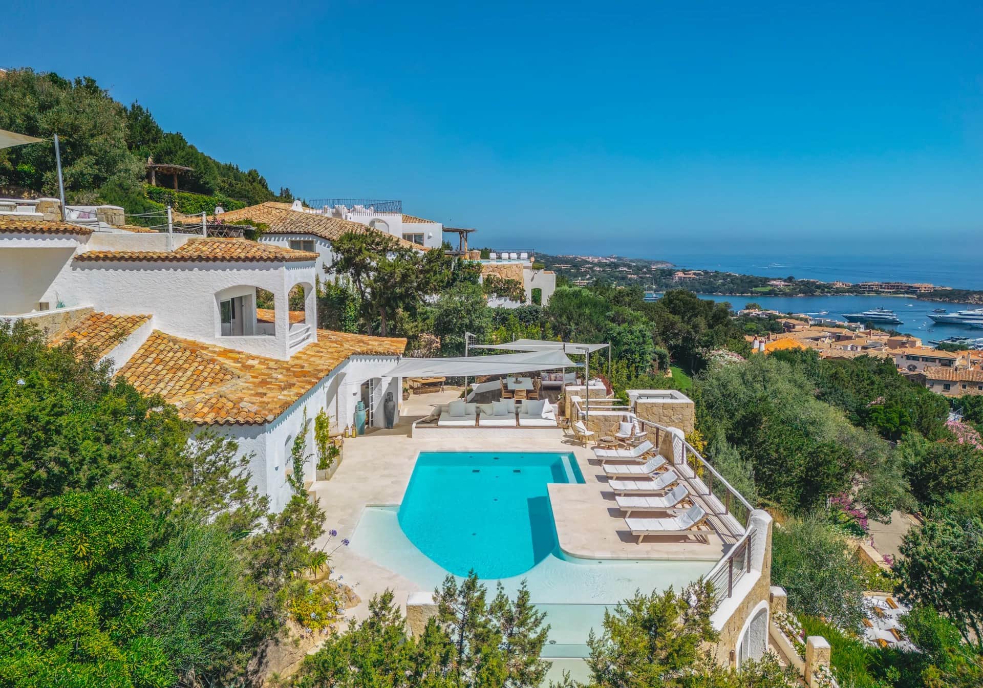 The exteriors feature expansive terraces and a heated infinity pool, lined with comfortable sunbeds and shaded daybeds that provide an idyllic setting for relaxation. Guests can also enjoy a shaded outdoor lounge and an al fresco dining area, complete with a charcoal BBQ, a rooftop terrace with a hot tub, and panoramic views of Porto Cervo town and the Mediterranean Sea.