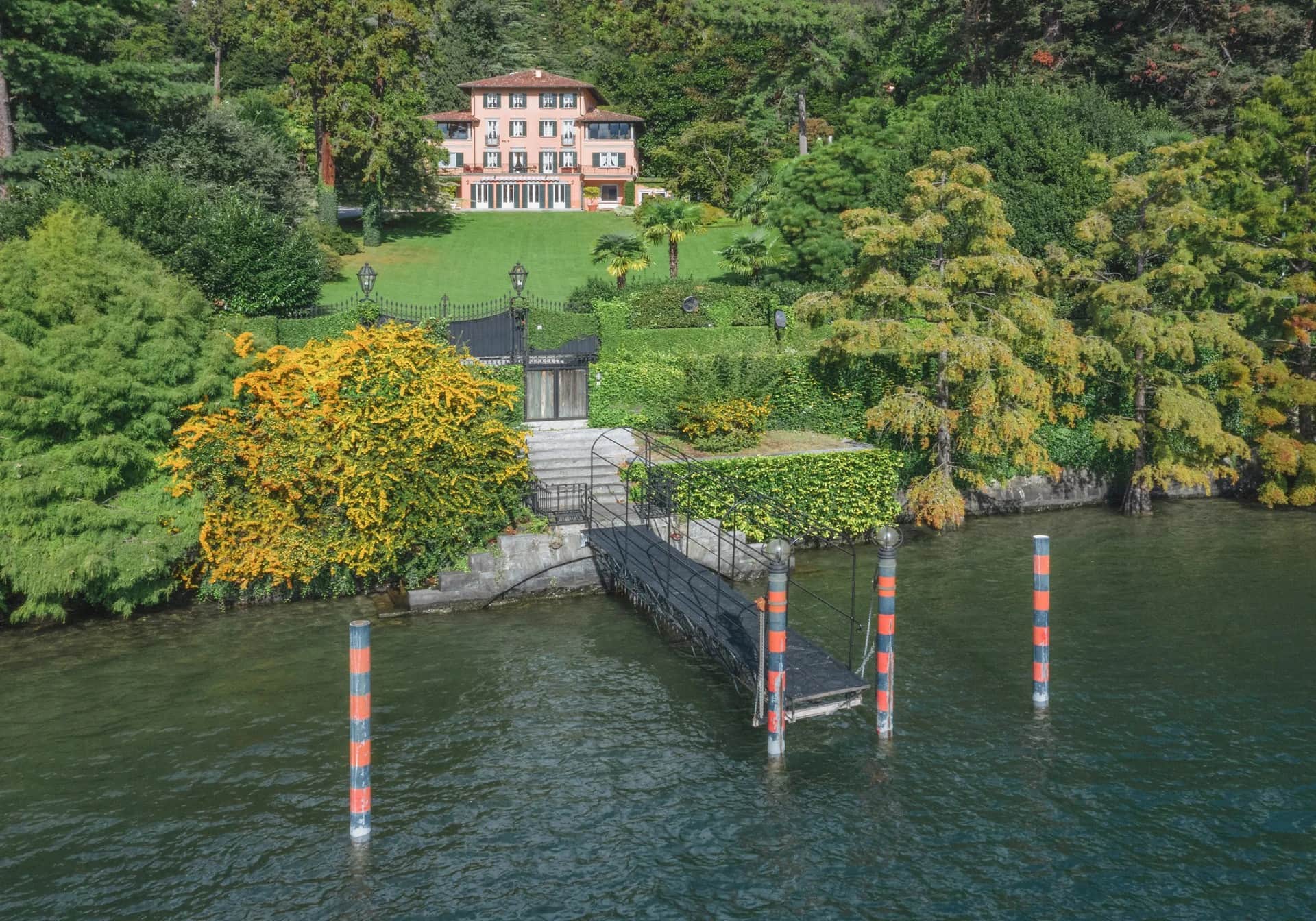 The property, built next to the lakeshore, is composed of a four-story main house. It features a total of 8 en-suite bedrooms, a game room, a tennis court, a 10 x 6 m heated pool, and stunning park-like gardens leading to a private dock. This beautiful 20th-century villa provides large, bright, and colorful interiors that stay true to the local style, with crystal chandeliers, a wooden staircase, a marble fireplace, stylish furnishings, and paintings.